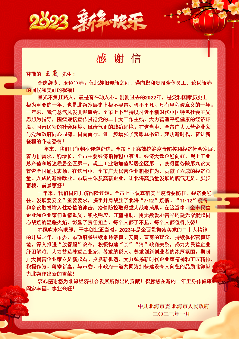 1月20日,廣西鳳翔集團(tuán)股份有限公司董事長王晟先生欣喜地收到北海市委、市政府的感謝信。市委、市政府衷心感謝王晟董事長和鳳翔集團(tuán)對北海市2022年的經(jīng)濟(jì)社會發(fā)展、群眾就業(yè)和疫情防控中等方面所做出的貢獻(xiàn),在給予高度肯定的同時并致以新春的慰問和美好的祝福。
