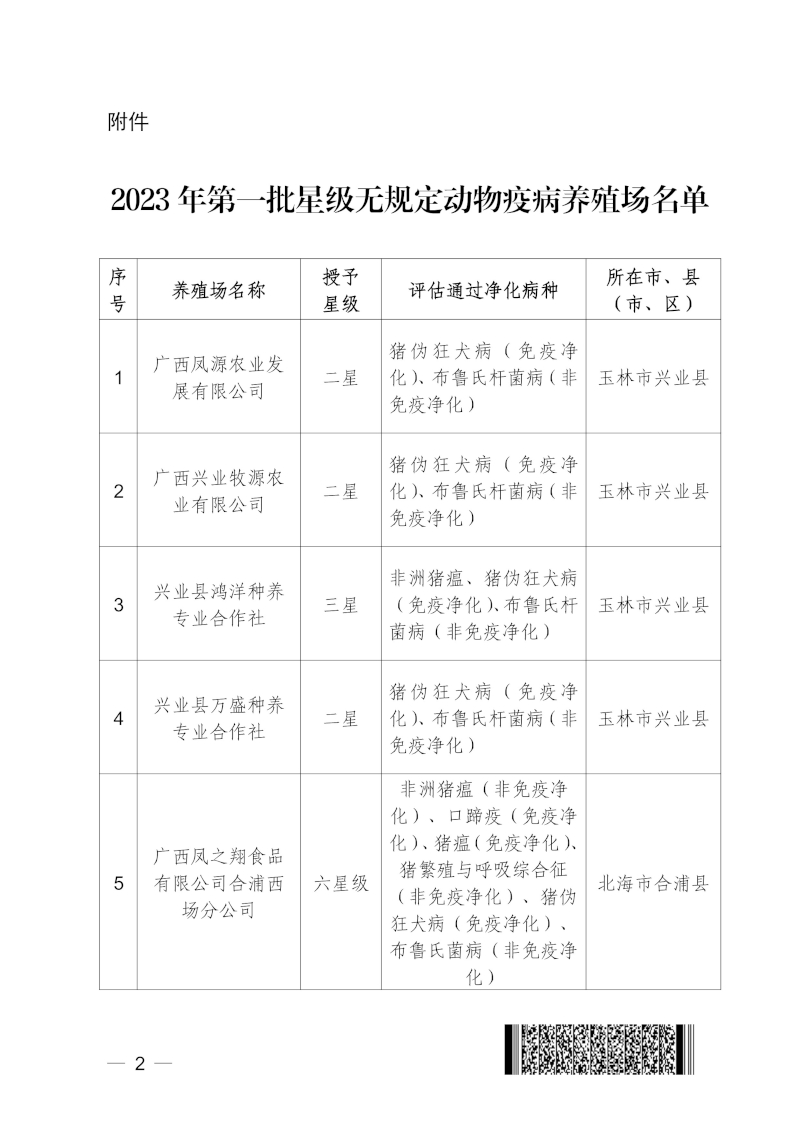 2023年6月27日,廣西壯族自治區(qū)農(nóng)業(yè)農(nóng)村廳公布了2023年第一批星級(jí)無(wú)規(guī)定動(dòng)物疫病養(yǎng)殖場(chǎng)名單,確定廣西鳳之翔食品有限公司合浦西場(chǎng)分公司等共5個(gè)養(yǎng)殖場(chǎng)為 2023年第一批星級(jí)無(wú)規(guī)定動(dòng)物疫病養(yǎng)殖場(chǎng),其中本公司是唯一獲評(píng)為“六星級(jí)無(wú)規(guī)定動(dòng)物疫病養(yǎng)殖場(chǎng)”的企業(yè),認(rèn)定本公司種豬對(duì)非洲豬瘟、口蹄疫、豬瘟、(非免疫場(chǎng))豬繁殖與呼吸綜合征、豬偽狂犬病、布魯氏菌病這6個(gè)病種都達(dá)到了凈化標(biāo)準(zhǔn)。
