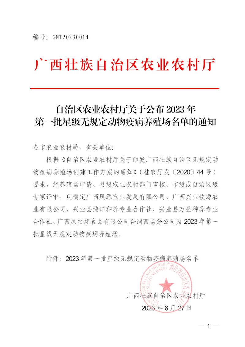 【概要描述】2023年6月27日,自治區(qū)農(nóng)業(yè)農(nóng)村廳公布了2023年第一批星級(jí)無(wú)規(guī)定動(dòng)物疫病養(yǎng)殖場(chǎng)名單,確定廣西鳳之翔食品有限公司合浦西場(chǎng)分公司等共5個(gè)養(yǎng)殖場(chǎng)為 2023年第一批星級(jí)無(wú)規(guī)定動(dòng)物疫病養(yǎng)殖場(chǎng),其中我司是唯一獲評(píng)為“六星級(jí)無(wú)規(guī)定動(dòng)物疫病養(yǎng)殖場(chǎng)”的企業(yè)。
